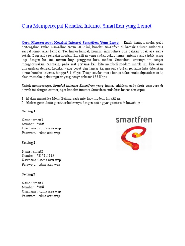 Apakah cara untuk mempercepat sinyal smartfren? Perlu diketahui saat mengatur apn ini, kamu harus menulis secara benar ya. Jun 07, 2021 · cara mempercepat jaringan smartfren unlimited yang terakhir yaitu dengan menggunakan aplikasi penguat sinyal. Mengatur atau mengganti apn smartfren merupakan salah cara mempercepat dan memperkuat jaringan smartfren. Tujuannya jelas agar smartfren lemot tak terjadi lagi dan berinternetan pun nyaman.